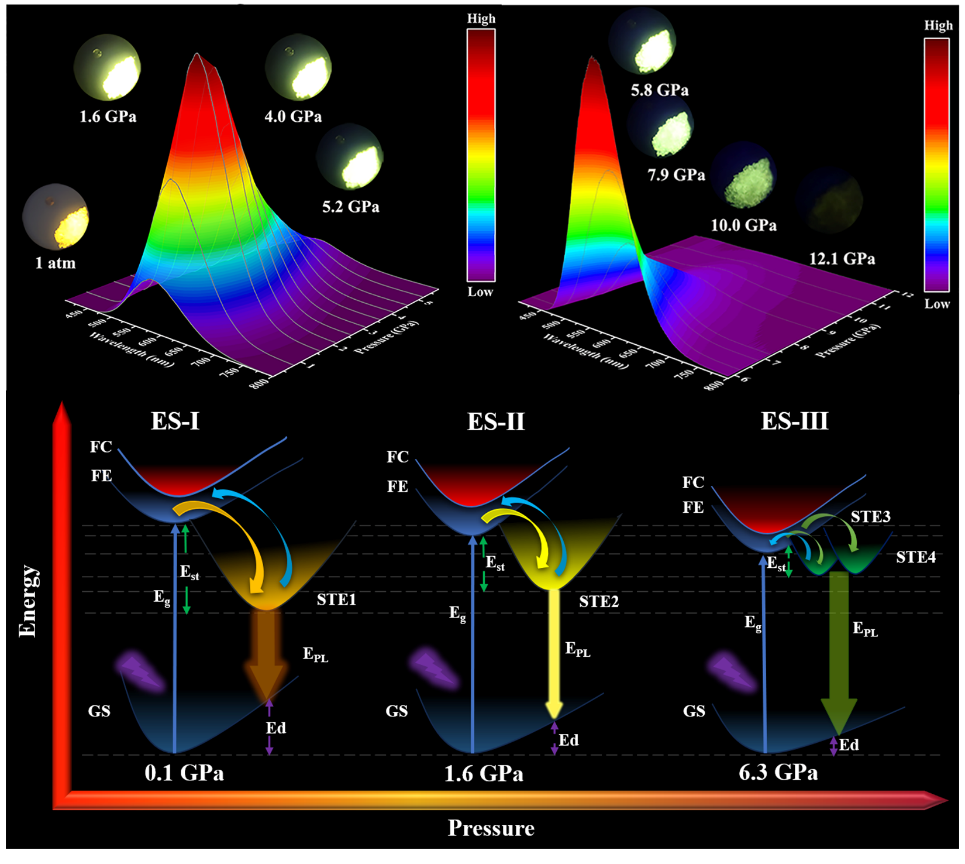 Cs2TeCl6是一种典型的非铅金属卤化物双钙钛矿材料,由于其软晶格和Jahn-Teller畸变,该材料展示了强的电子-声子耦合,并表现出与自陷激子(STE)相关的大斯托克斯位移宽带发射。这使得该材料在光电子和光学领域具有广泛的应用前景。本文作者们利用基于金刚石对顶砧的高压原位稳态光致发光光谱、稳态吸收光谱、X射线衍射光谱、拉曼散射光谱、交流阻抗谱和时间分辨光致发光光谱测量,揭示其压力调控STE发射增强和猝灭的物理机制。研究发现,在整个加压过程中,Cs2TeCl6的电子-声子耦合强度可调谐,在1.6GPa和5.8GPa处,该材料分别发生了电子态相变,并且在1.6GPa处电子-声子耦合强度适中,此时其的发光强度为常压下的4.8倍,STE的辐射复合寿命是常压下的10.0倍。表明Cs2TeCl6中压力依赖的发射强度变化由STE的自捕获和辐射复合能力共同调控。该研究为理解具有宽带发射和大斯托克斯位移特性的钙钛矿材料中的STE动力学行为和发光物理机制提供了帮助,为高性能和多功能新型光电器件的开发和应用奠定了基础。探花 2022级硕士生施涵和2021级硕士生陈林为共同第一作者,郑州大学王玲瑞教授、郑州大学郭海中教授和探花 刘才龙教授为共同通讯作者,探花 为第一署名单位。