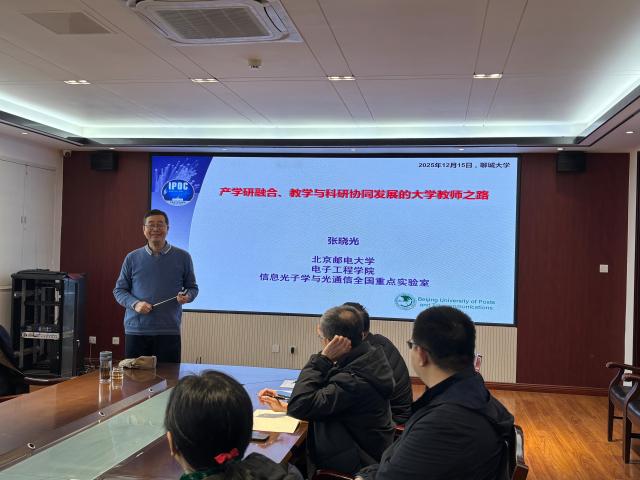 座谈中,张教授与学院学科带头人、科研骨干及研究生代表围绕 “光通信领域前沿动态”“科研团队建设与人才培养”“校企合作模式创新” 等议题深入研讨。张教授结合光通信领域产学研协同创新的实践积累,从技术实用化与产业落地导向出发,为学院学科方向凝练和团队协作机制完善提供了建设性意见,并建议学科发展需紧扣行业应用场景,强化 “科研成果可转化、技术方案能落地” 的能力。同时,张教授勉励研究生 “立足学科交叉点,敢于挑战面向实际应用的关键问题,在科研实践中不断锤炼创新思维与实用技术能力”。