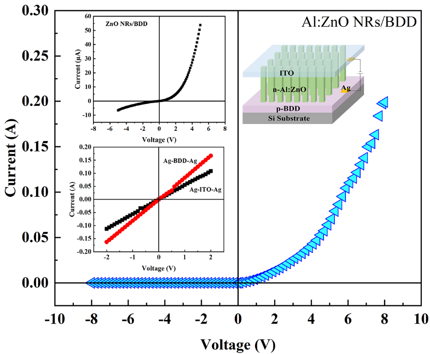 ZnO纳米材料由于其较低的激光阈值和较高的光学效率,被视为光电应用领域的可行候选材料。近年来,不同p型衬底材料与ZnO纳米材料相结合制备的异质结结构被广泛应用于光电子器件等领域。与硅(Si)、氮化镓(GaN)等传统衬底材料相比,掺硼金刚石(BDD)具有高导热性、宽禁带(5.47eV)、高击穿电压(~107V/cm)、高电子空穴迁移率(2400cm2/(V·s))、化学稳定性和室温抗辐射性能等优异性能。因此,将ZnO纳米材料与BDD结合形成的异质结器件在高温、高频和高功率等恶劣环境下表现出耐用可靠的光电性能。为了进一步调控优化该异质结系统,研究团队通过对ZnO掺杂铝元素,改进了ZnO纳米棒/p-BDD异质结的光致发光和电学性质。n-Al:ZnO纳米棒/p-BDD异质结光致发光强度显著增强,且紫外发射峰出现明显蓝移。异质结I-V特性曲线表现出较好的整流特性(如图1所示),在5V下具有838的高整流比,比n-ZnO纳米棒/p-BDD异质结的整流比(19.3)高40倍以上。在5V正向偏压下,正向电流高达67.5mA,是n-ZnO纳米棒/p-BDD异质结的1300倍以上。通过构建能带结构模型(如图2所示),探讨了该异质结载流子输运行为的物理机制。本研究工作为未来耐高温、高频等恶劣环境下金刚石基纳米光电器件的开发提供了新的设计和应用思路。