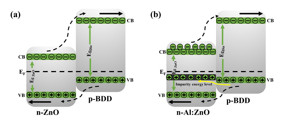 图2. (a) n-ZnO 纳米/p-BDD异质结和(b) n-Al:ZnO 纳米棒/p-BDD异质结的能带结构图