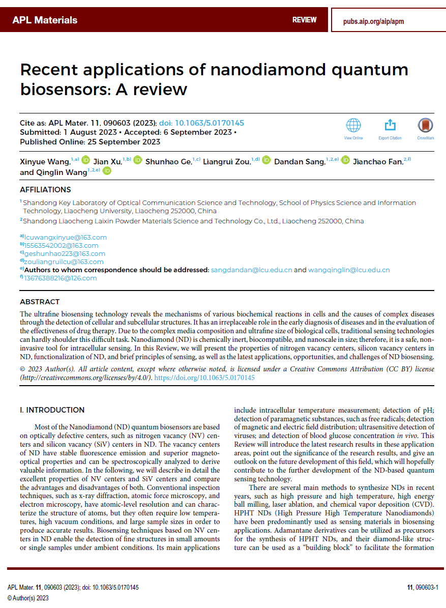 “Recent Applications of Nanodiamond Quantum Biosensors(纳米金刚石量子生物传感器的最新应用)”总结了近年来纳米金刚石量子生物传感器在多个领域的应用进展,例如纳米金刚石量子生物传感器在生物体内精细结构内的温度监测,磁场分布及自由基浓度的检测,病毒的超灵敏检测以及葡萄糖浓度的检测等。此外,文章对纳米金刚石量子生物传感器在其他领域中的进一步应用进行了展望,提出了新的见解。例如,纳米金刚石量子生物传感器可实现快速精准地检测较低浓度的病毒,有利于提高今后对大型传染病等危机的应对能力等。2020级物理学专业本科生王鑫悦为文章第一作者,2020级物理学专业本科生徐健参与了部分工作,桑丹丹副教授、王庆林副教授为文章通讯作者,探花 为第一署名单位。