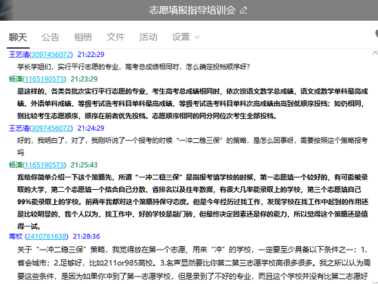 志愿者线上为学生和家长讲解了填报志愿的具体流程,从招生计划、报考原则、规避填报误区等方面,对考生及家长进行详细指导,并提出了认真全面了解高校情况、客观分析上线情况、重点参考排名情况填报、梯度配置填报志愿、理性定位专业志愿等具体可行的建议。同时,志愿者鼓励考生根据自己的兴趣爱好、学习水平等进行理性评估,合理平衡学校和志愿专业的关系,降低志愿填报风险。随后,志愿者提醒考生们尽早制定人生规划,明确填报思路,同时针对贫困县专项招生政策进行了详细解读,提醒考生充分利用招生政策获得更好的发展。考生提出的问题均得到了志愿者的耐心解答,与会考生纷纷表示,通过此次讲座,对高考志愿填报的流程、方法、误区等有了更为清晰的认识,对院校与专业选择等填报技巧有了更好的把握。