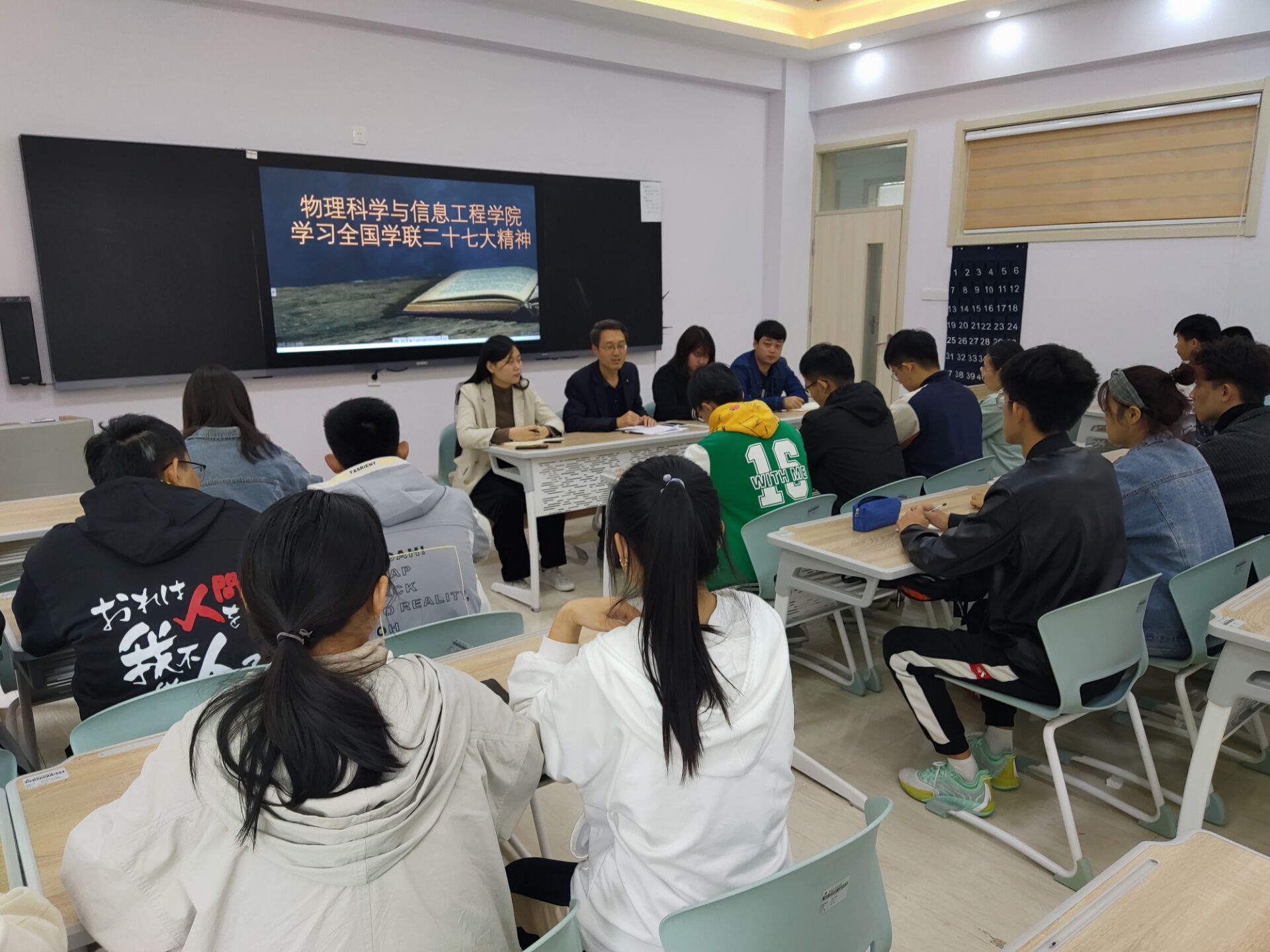 赵海军从二十七大精神内容切入,领学了习近平总书记的贺信全文、中央领导同志代表党中央在大会上的致词、团中央书记处第一书记贺军科同志的大会致词、中国科协书记处第一书记怀进鹏代表人民团体致辞。在会议中,同学们交流分享了学习大会精神的感受和体会,大家纷纷表示,全国青联十三届全委会和全国学联二十七大的召开,是青联、学联改革发展中的一件大事,学联在逐渐优化组织结构,加快自身改革步伐,在以后工作中,应发挥学联的优势特点,进一步完善自身工作,将会议精神落实到实处。