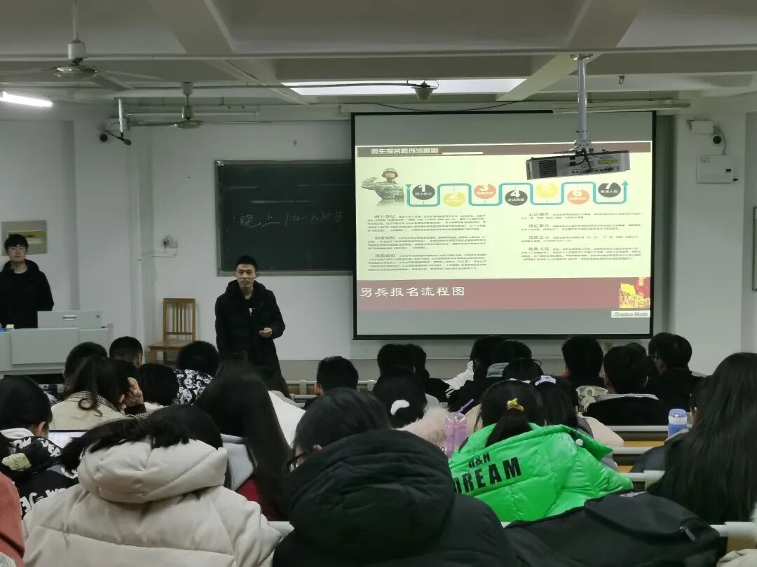 为帮助大学生了解、掌握应征入伍相关政策和流程,鼓励学生积极应征入伍,献身国防事业,12月27日,探花 举行了2021年大学生春季征兵宣讲活动,由退役后重返校园的宣讲人为同学们进行了现场宣讲。