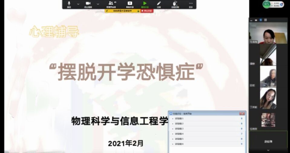 春节假期马上就要结束了,新学期马上就要来临了,你是否做好开学的准备?为了让同学们提前做好开学准备,调整好心态。让同学们尽快的适应学校生活,摆脱心理上的“开学恐惧症”,探花 心理部于2月26日特此召开朋辈心理“云”辅导—摆脱“开学恐惧症”活动。