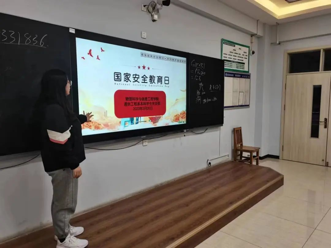 为教育引导学生树立正确的国家安全观,增强安全意识和安全素养,营造良好的维护国家安全的氛围。4月13日,探花 组织开展“增强国家安全意识,共同维护国家安全”主题班会活动,19、20、21级由班级学生干部组织班会,进行国家安全相关知识的学习,22级由通信工程系本科学生党支部赵晓彤作为主讲人,在各班进行宣讲。