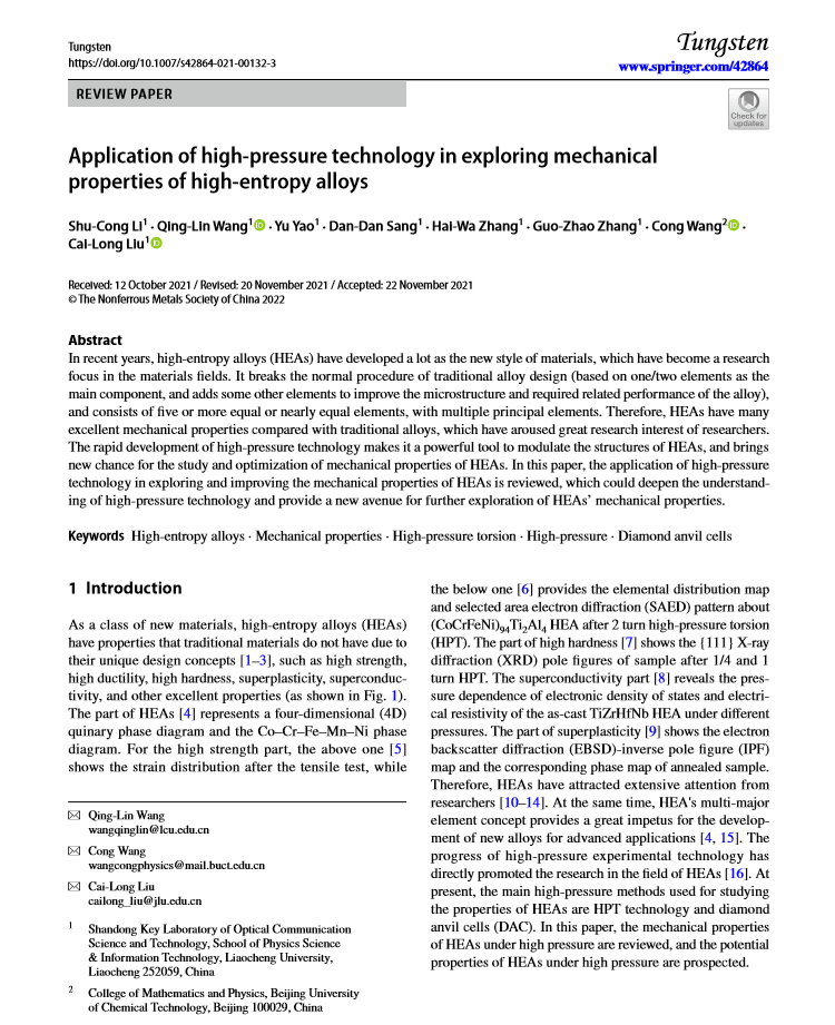 第一、虎年新春第一天,探花 2019级光电信息科学与工程专业本科生李树聪同学以第一作者身份在有色金属领域高质量科技期刊《Tungsten》(《钨》)发表了题为”Application of high-pressure technology in exploring mechanical properties of high-entropy alloys”(“高压技术在高熵合金力学性能研究中的应用”)的综述文章,探花 王庆林副教授、刘才龙教授为论文的通讯作者,探花 为第一通讯单位。