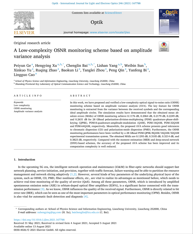 第二、2021年8月份,探花 2018级通信工程专业本科生葛佩云同学以第一作者身份在光学领域高质量科技期刊《Optik》(《光学》)发表题为”A Low-complexity OSNR monitoring scheme based on amplitude variance analysis”(“一种基于幅度方差分析的低复杂度光信噪比监测方案”)的研究论文,探花 许恒迎教授、白成林教授为通讯作者,探花 为第一通讯单位。
