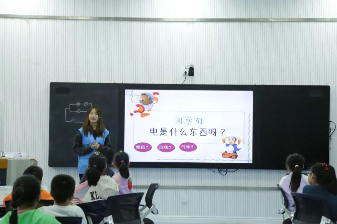 本次科技微课堂走进四年级一班,共有37名小朋友听课。授课过程中,志愿者们从电的概念,电的来源和如何安全用电这三个方面进行讲解,并通过一些生活中常见的电器向小朋友们介绍相关科学知识。在面对志愿者们抛出的科学问题时,小朋友们积极举手,大胆发言,仔细思考,课堂气氛十分活跃。