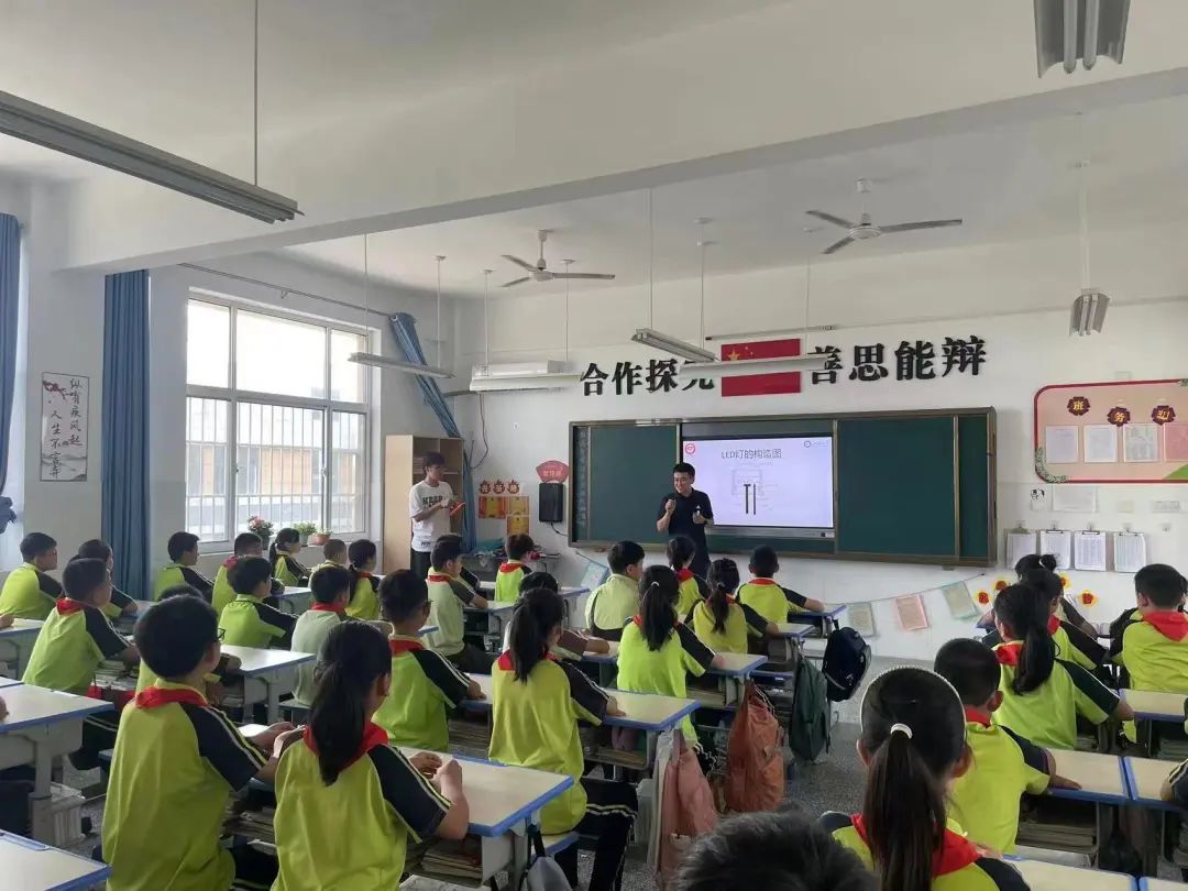 在授课环节中,范鑫烨结合生活实例,为学生们细致耐心地讲解了电是什么、电的产生、LED灯的构造的以及用电安全方面的科学知识,王秋国以通俗易懂的授课方式讲解了串并联电路,面对两位老师抛出的科学问题,学生们开动脑筋仔细思考,积极举手,大胆发言。在展示互动环节,现场展示了智能小车,以此帮助学生对电的理解,加强学生对电的认知。授课结束后,度假区中心小学负责人对两位老师的授课致以深深的感谢,表示此次授课进一步推动了课堂教学的新形式、新内容、新趣味,期望科技微课堂再次与学生们的见面。