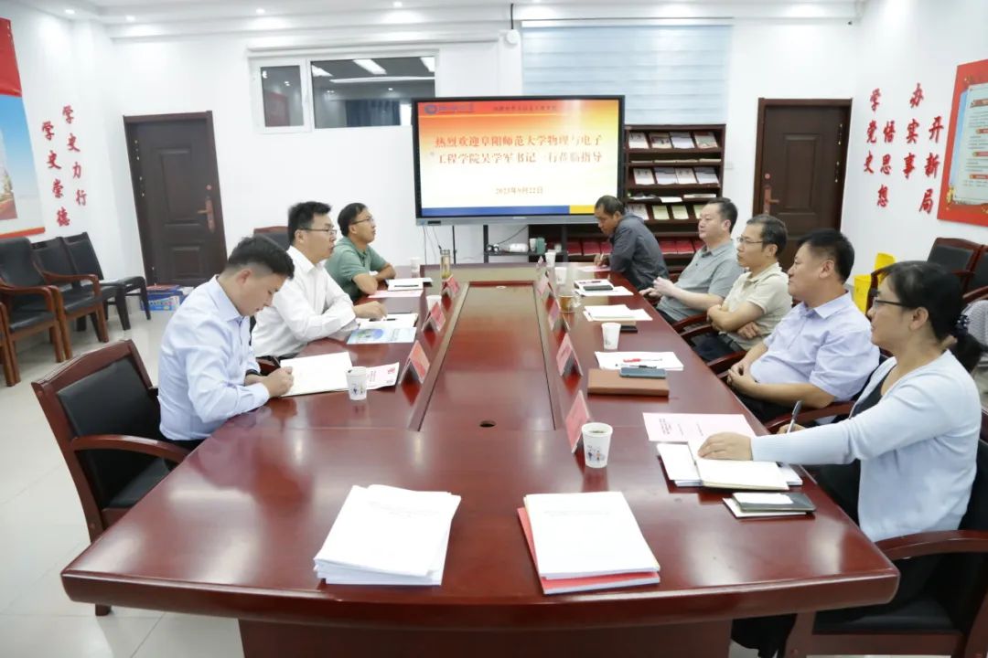9月22日,阜阳师范大学物理与电子工程学院党委书记吴学军一行来访探花 进行考察交流,探花 党委书记高金华、院长王明红、党委副书记吴成、副院长张霞等参加座谈会。