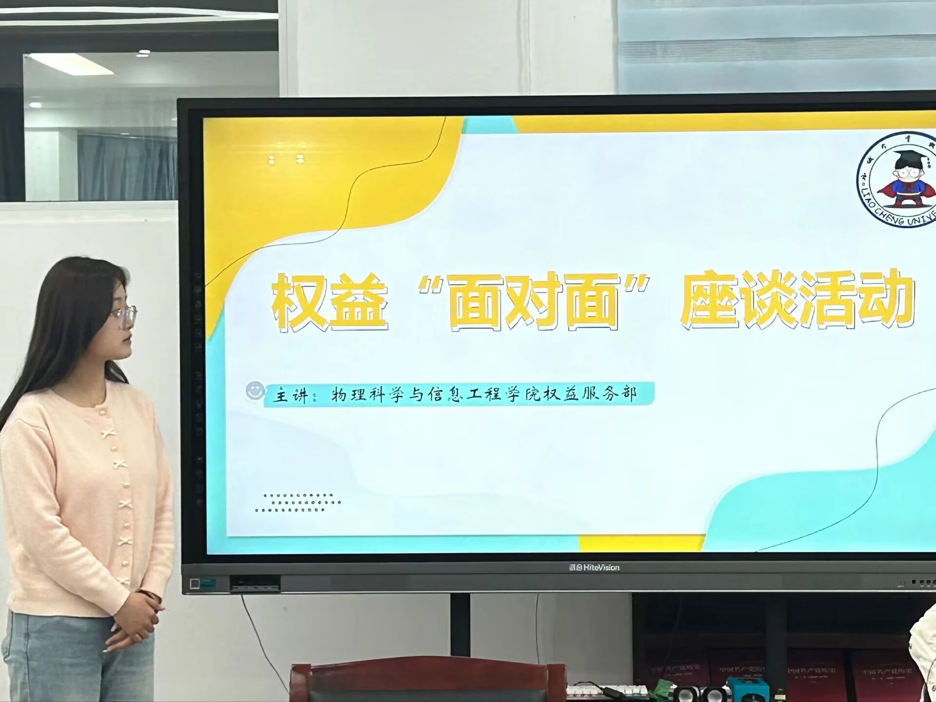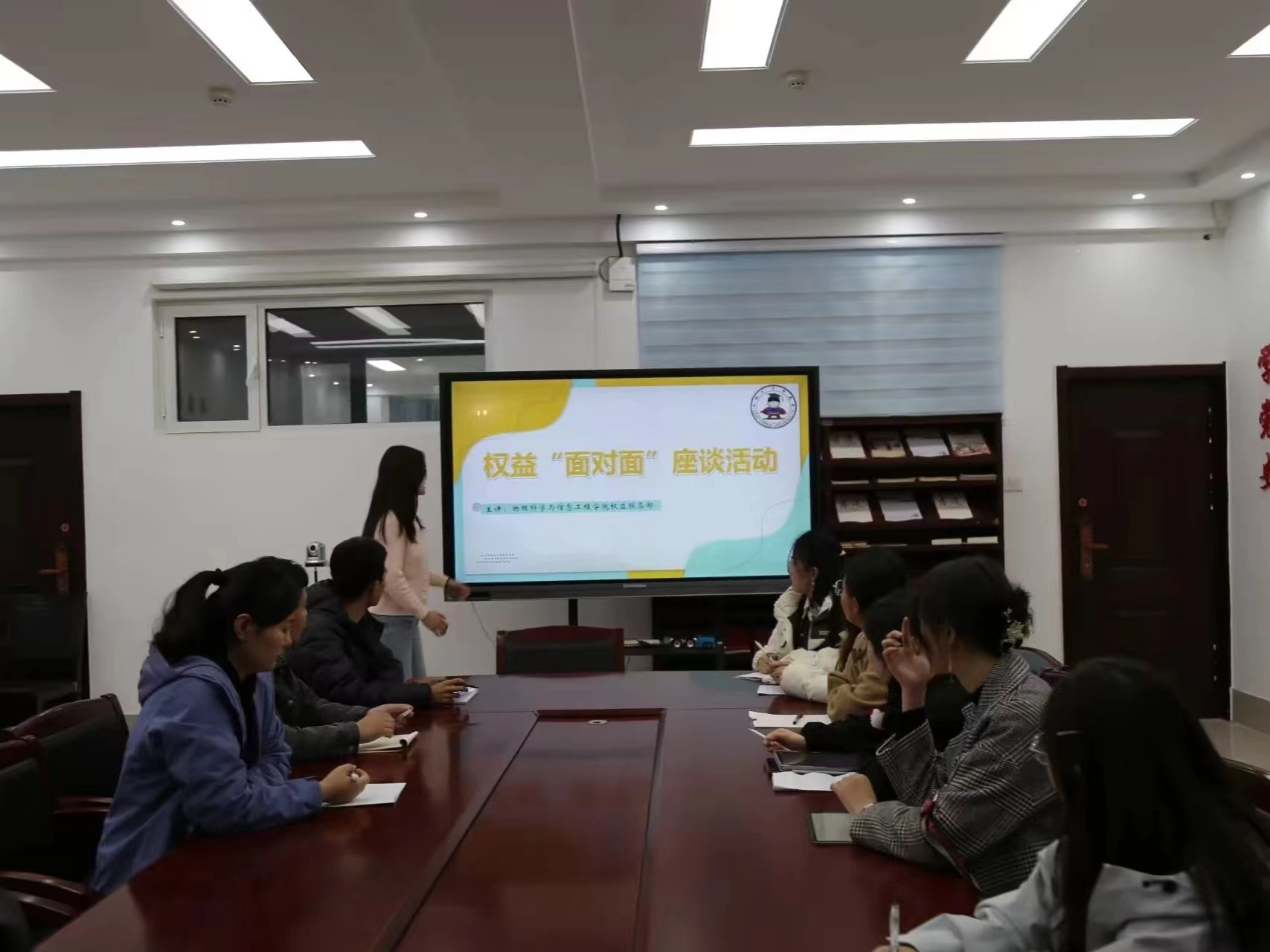 座谈会伊始,主持人武旭艳首先对校权益部的工作内容及工作机制进行系统说明,详细介绍了部门线上线下两条维权服务渠道,增进了同学对权益问题解决途径的了解。随后,主持人针对之前收集的权益问题,如饮水机、宿舍空调、餐厅卫生等方面,给出了详细解答。此外,主持人对于常见生活问题进行了总结回复,分享了学校查询权益问题信息的相关渠道,提高了权益问题解决效率,促进了权益工作的有序进行。之后,权益委员们积极提出问题并与老师积极探讨协商,共同寻找更加合理的解决方案,以便利同学们的日常生活。最后,洪文静对权益工作表示支持与肯定,并鼓励同学们深入日常生活,积极提出有关权益的问题,提高自我服务、自我管理、自我建设校园的责任意识。