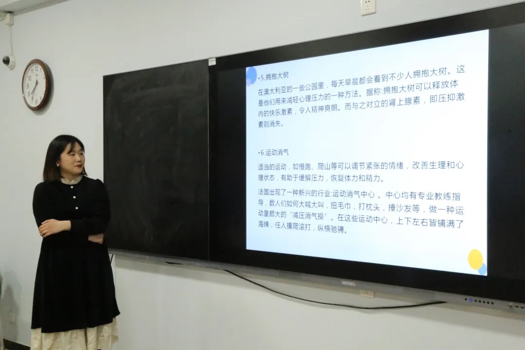 此次活动邀请到应用心理学专业的优秀研究生左露露来为大家进行讲座。活动中,左露露针对学生压力问题,从四个方面入手,分别是“你有压力吗”、“压力是什么”、“压力来自哪里”和“如何化解压力”。在第一个问题中,左露露为同学们准备了各式各样的测试题,通过题目的不同选择检测出学生不同方向上的心理压力,整个测试过程不仅带动了同学们积极性,还帮助同学们今后更好的了解到自身的压力情况。在接下来的两个问题中,左露露向同学们介绍了什么是压力,她提到压力是心理压力源和心理压力反应共同构成的一种认知和行为体验过程,而压力主要分为两部分,分别是内部压力和外部压力,并向同学们展示了内部压力和外部压力的不同来源,其中外部压力主要来源于家庭、学校、社会、环境等方面,而内部压力的来源与外部压力完全不同,它主要源于不能自我肯定和过度追求完美等自身方面,这两个问题的深度讲解有助于大家更好的理解压力是如何产生的,以及自身存在着哪些压力。最后,针对“如何缓解压力”这个问题,左露露向同学们提供了12种基本的缓解方式,其中包括运动、冥想、卧床休息等。左露露提到,这12种缓解方式不一定适应于每一个人,也许同学们也有自己独特的缓解方式,但不论采用哪种方式,都要学会积极主动的释放压力,缓解压力,这样才有助于大家健康的心理成长,丰富同学们精彩的大学生活。
