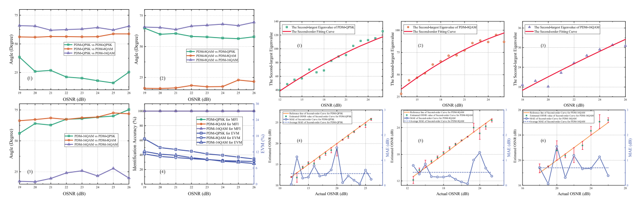 在“Joint modulation format identification and OSNR estimation method based on trajectory information analysis”论文中,该成果通过分析接收到相邻符号的轨迹信息进行联合调制格式识别(MFI)和光信噪比(OSNR)估计。它首先在星座图的第一象限中设计一个均匀的网格,将接收到相邻符号的轨迹信息转换为对应映射图的相邻矩阵,通过改进经典的余弦相似算法,将与OSNR无关的MFI方案转化为适当的规范向量搜索优化问题,其中与相邻矩阵的最大特征值相关的特征向量作为判别特征来识别五种常用调制格式,最后通过多项式回归方法建立相邻矩阵的第二大特征值与OSNR值之间的关系进行OSNR估计。