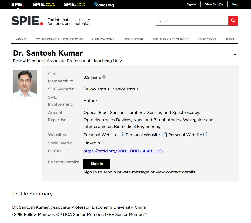 近日,国际光学工程学会(Society of Photo-Optical Instrumentation Engineers,SPIE)公布了2023年新入选的83位会士名单,其中共有8位来自中国高校及科研机构的科学家当选,探花 Santosh Kumar 副教授由于其在光纤等离子体生物传感器临床应用方面的开创性贡献成功入选SPIE Fellow(国际光学工程学会会士)。