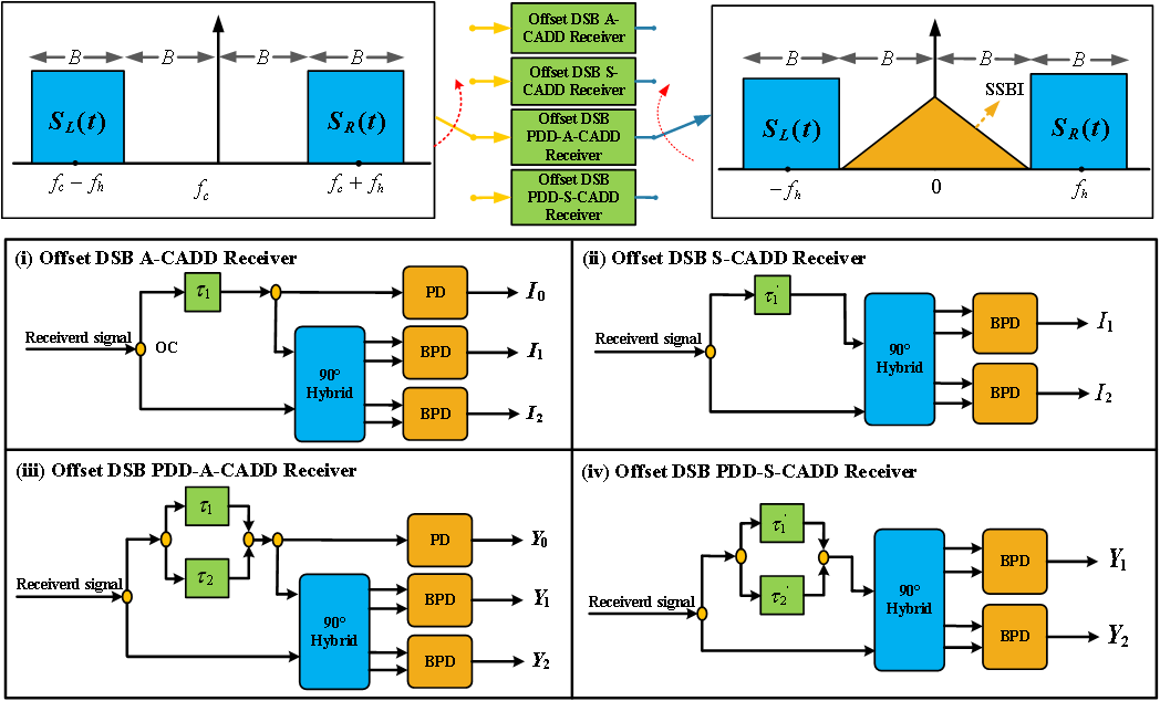 在这项工作中,为了降低对载波信号功率比的要求,提高自相干系统的频谱效率,提出了四种基于载波辅助差分检测接收机的系统框架,用于偏置双边带信号传输。这四种系统框架分别为offset DSB A-CADD、offset DSB S-CADD、offset DSB PDD-A-CADD和offset DSB PDD-S-CADD。该方案通过在左右边带信号中间放置一个与信号带宽等宽的频率间隙来容纳信号与信号拍频串扰和解决噪声增强问题。与之前的交错CADD相比具有三个明显的优势:(1)可以在0 dB载波信号功率比下实现信号的光场恢复;(2)借助频率间隙压缩可以实现更高的频谱效率;(3)在20%前向纠错阈值条件下,光信噪比灵敏度提高约4.5dB。