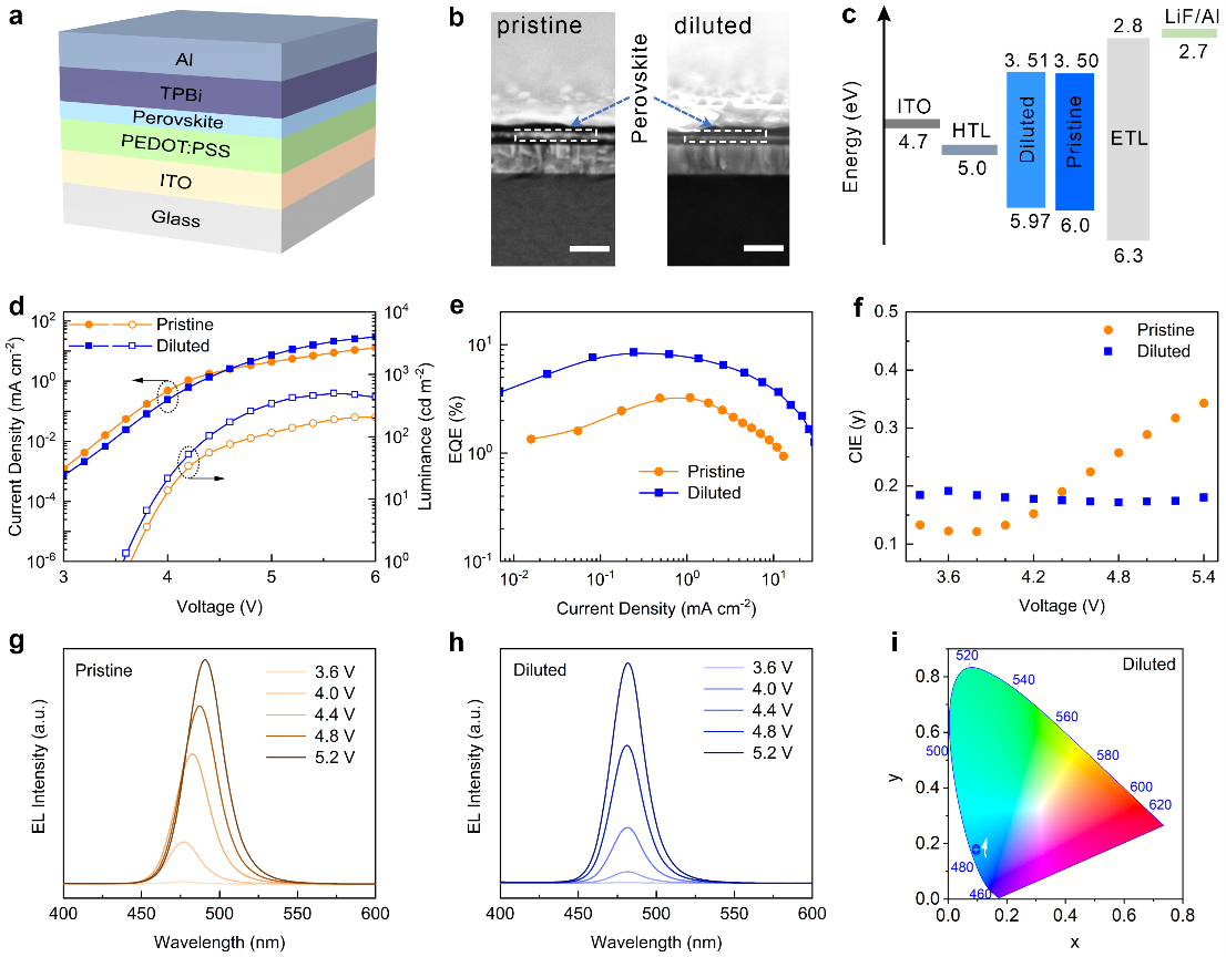 本文针对混合卤素容易在电场下发生相分离的问题,提出了调控结晶动力学的方法,通过稀释前驱体的浓度改善钙钛矿成膜和卤素分布。结果表明均质化的卤素分布降低了非辐射复合速率,同时抑制了离子迁移。制备的器件达到8.5%的外量子效率,并且在482nm处实现稳定的天蓝光发射(如图1所示),此工作为解决目前蓝光普遍存在的相分离问题提供了一种简单的方案。