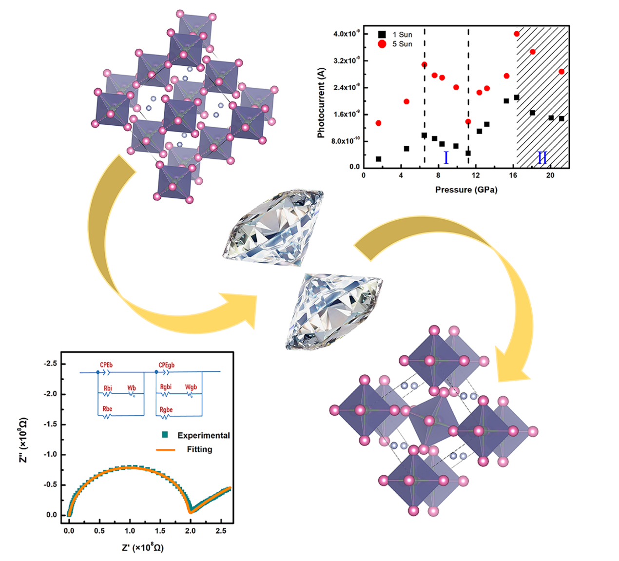 压力在调控卤化物钙钛矿太阳电池材料的光响应和电输运性质中扮演者重要的角色。(NH4)2SeBr6作为非铅卤化物双钙钛矿材料,避免了有毒铅元素的使用,是清洁光伏和光电器件的理想候选材料之一。本工作中,作者们通过高压原位拉曼散射光谱测量实验研究发现(NH4)2SeBr6在16.0GPa发生了立方相到四方相的结构相变,通过高压原位交流阻抗谱和直流光电导测量实验研究了(NH4)2SeBr6在常压至21.2GPa的电输运和光电响应特性。研究发现,(NH4)2SeBr6的光电流随压力逐渐增强,在6.5GPa处达到第一个峰值,之后光电流值随压力的增加逐步减小,在11.2GPa出现第二次光响应增强,并在16.4GPa处达到第二个峰值。(NH4)2SeBr6在II相(四方相)的光电响应优于I相(立方相)。在整个压力区间内电子传导在(NH4)2SeBr6样品的电输运过程中起主导作用。这些研究可以更加深入地了解非铅双钙钛矿材料,对将来更好地开发钙钛矿光伏光电器件具有实际的帮助。