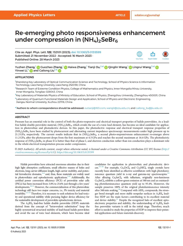 近日,探花 刘才龙教授课题组在非铅双钙钛矿材料的电输运和光电性质的压力调控研究方面取得重要进展,相关成果以“Re-emerging photo responsiveness enhancement under compression in (NH4)2SeBr6(压缩条件下(NH4)2SeBr6中重新出现的光响应性增强)”为题发表在物理类权威期刊《Applied Physics Letters》(《应用物理快报》为中科院二区Top期刊,Nature Index收录)上。2020级物理学专业硕士生张育祯为论文第一作者,探花 为第一通讯单位。