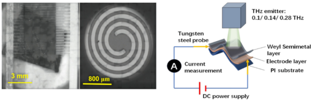 目前高性能室温下的太赫兹波段探测器主要基于石墨烯等二维材料,因为其带隙接近于零,使它们能够激发太赫兹波段的载流子。纳米材料的广泛应用提高了器件的光学响应性。然而,有效的检测区域为纳米尺度,可能限制了其应用。柔性第六代通信技术探测器将满足第六代通信与物联网技术的集成,更好地促进人机交互,进一步推广第六代通信技术,因此柔性大面积高响应太赫兹探测器的设计在光电器件的发展中具有良好的应用前景。然而针对用于第六代通信波段的探测器,结合好大面积、柔性、非聚焦、室温下高探测性能等功能的探测技术依然是亟需解决的重要问题。团队设计了大面积柔性薄层太赫兹探测器,结合了在低光子能量电磁波检测中优异的光电性能和亚波长结构探测器中的局域化的表面等离基元效应的优点。由于有效面积大,圆盘电极器件在室温下的性能最好。此外,弯曲实验也表明了该器件在柔性第六代通信探测器的应用中具有极大的优势。