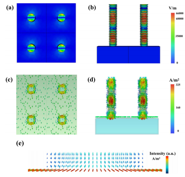 图2器件针对0.1太赫兹时的电场表面分布及电流表面分布图