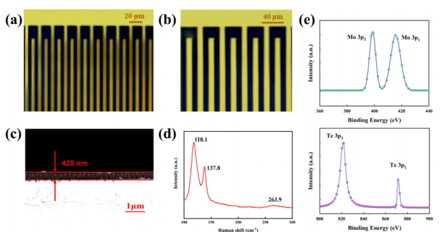 为满足第六代通信物联网边缘智能技术对超灵敏探测器的需求,团队采用磁控溅射技术制备了大面积的外尔半金属层,通过控制退火条件获得了高质量的外尔半金属活性层,然后制备了薄金层作为微腔反射层,采用飞秒激光直写技术加工了二维微结构图案,并同时引入了电磁感应阱和局域化的表面等离基元效应。在优选处理的36nm金膜和150°C、退火时间为一小时的二碲化钨薄膜条件下,检测灵敏度为34A/W,折线角度为90°,固定线宽为20μm,线间距为70μm。等效噪声功率为1.8pW/Hz1/2,响应时间为80ms。所提出的方案为制造具有工业化生产潜力的高性能太赫兹探测器提供了可能,并为第六代通信技术的发展提供了有效的技术解决方案。