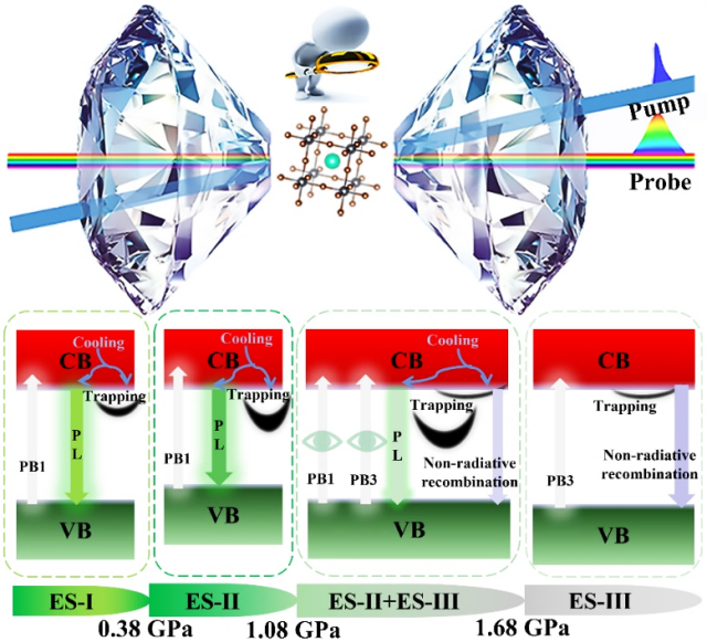 进展一:钙钛矿材料中的载流子超快动力学行为一直以来备受关注。刘才龙教授团队利用高压原位稳态光致发光、稳态吸收和飞秒瞬态吸收光谱探测技术,对CsPbBr3量子点压致电子态转变、荧光猝灭和带隙演化中的超快动力学行为进行了实验探究。研究发现,高压原位飞秒瞬态吸收光谱可以有效区分混合电子态,并获得压力依赖的载流子超快动力学寿命,揭示了CsPbBr3量子点压致荧光猝灭和消失的微观物理机制。这项工作对于改善钙钛矿材料的光物理性能至关重要,为拓宽其在光电探测器、发光二极管和太阳能电池等领域的应用提供了重要的指导。相关研究成果以“Ultrafast Dynamics across Pressure-Induced Electronic State Transitions, Fluorescence Quenching, and Bandgap Evolution in CsPbBr3 Quantum Dots”(CsPbBr3量子点在压力诱导的电子态转变,荧光猝灭和带隙演化过程中的超快动力学)为题发表在《Advanced Science》(《先进科学》)上。2021级硕士生陈林和楚亚博士为共同第一作者,张海娃博士、郑州大学郭海中教授和刘才龙教授为共同通讯作者,探花 为第一署名单位。