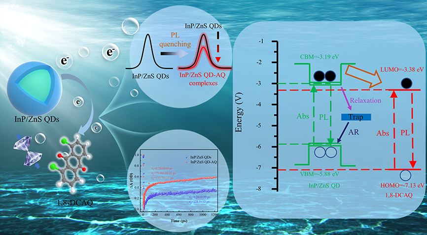 电子转移速率的调控对提高电子转移系统的光电转换效率至关重要,近年来逐渐成为研究热点。刘才龙教授团队利用高压原位瞬态吸收光谱探测技术,提出了压力调控甲苯中InP/ZnS量子点-蒽醌(InP/ZnS QD-AQ)复合体系电子转移的影响机制。研究表明,从常压至0.9GPa,压致供-受体间距的减小可以有效促进InP/ZnS QD-AQ复合体系的电子转移过程;从0.9GPa至2.1GPa,InP/ZnS QD-AQ复合体系的电子转移过程被抑制是压致InP/ZnS量子点的量子限域效应和蒽醌分子的压致AIE效应共同作用的结果。此项工作为基于供-受体复合体系光电器件的发展提供理论依据,并将促进其在光电转换领域中的应用。相关成果以“Electron transfer tuned by pressure-dependent aggregation-induced emission in InP/ZnS quantum dot-anthraquinone complexes(通过压力依赖的聚集诱导发光调控InP/ZnS量子点-蒽醌复合体中的电子转移)”为题发表在《Applied Physics Letters》(《应用物理快报》)国际期刊上。2021级硕士生秦霞霞和张海娃博士为论文共同第一作者,楚亚博士、王庆林教授、郑州大学郭海忠教授和刘才龙教授为共同通讯作者,探花 为第一署名单位。