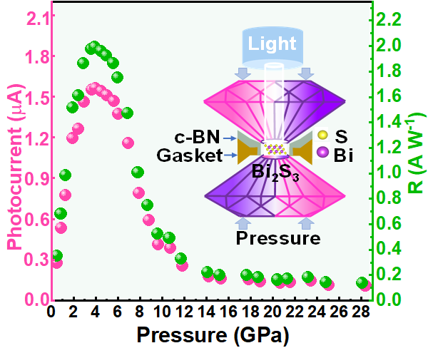 Bi2S3具有低毒性、低合成成本、吸收系数及载流子迁移率高等优点,成为光电探测器的潜在候选者。然而,由于其电子-空穴复合速度快和光腐蚀等影响降低了其光敏行为。为克服这一挑战,刘才龙教授团队提出压力调控Bi2S3光电响应的方案。通过将高压原位光电流、变温电阻率、拉曼散射光谱、可见吸收光谱测量和理论计算方法相结合,系统研究了压力作用下Bi2S3的光电、电输运、振动模式和能带结构。研究发现,压力作用下Bi2S3显示出两种不同的光响应信号(正/负光电流),0.5~4.0GPa范围内光电流随压力的增加出现显著增强(最大值约为初始值的5.6倍)。在30.3GPa以上,Bi2S3呈现负光电流响应,可归因于压致金属化相变引起的光热效应。研究结果为调控Bi2S3的光电性能提供了新思路,为优化基于Bi2S3光电子器件提供了更多的可能性。相关成果以“Pressure-induced photo responsiveness enhancement and positive–negative switch in Bi2S3(Bi2S3中的压力诱导光响应增强和正负光电流转换)”为题发表在《Applied Physics Letters》(《应用物理快报》)上。2021级硕士研究生冯浩铖和张国召博士为论文共同第一作者,王光宇博士、房媛媛副教授和冯振豹副教授为共同通讯作者,探花 为第一署名单位。
