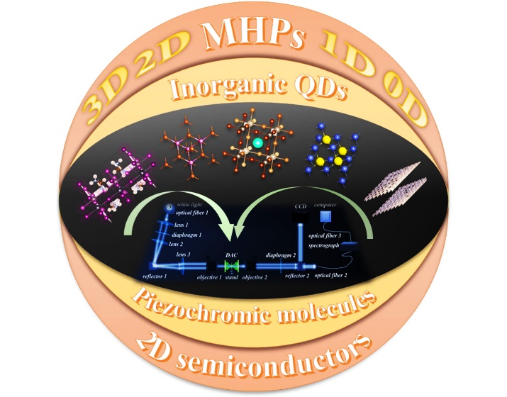 进展三:近年来,压力诱导带隙调节作为一种新颖而有效的手段,揭示了固有能带性质和深层结构-性能的关系。基于几种典型的半导体材料,包括金属卤化物钙钛矿、无机量子点、压致变色分子化合物和二维半导体材料,刘才龙教授团队概述了利用显微稳态紫外-可见吸收光谱技术的压力诱导带隙响应的系列研究,总结了高压条件下结构对带隙演变的影响以及带隙工程的一般原理,为环境条件下的材料设计提供指导。相关研究成果以“A review: comprehensive investigation on bandgap engineering under high pressure utilizing microscopic UV-Vis absorption spectroscopy(评论:关于利用微区紫外-可见吸收光谱技术在高压下进行能隙工程研究的综合调查)”为题发表在《APL Materials》(《APL材料》)上。2021级硕士生陈林为论文第一作者,张海娃博士、李茜教授和刘才龙教授为共同通讯作者,探花 为唯一署名单位。
