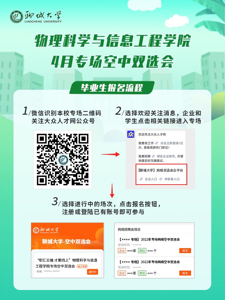 手机微信扫码关注“大众人才网”微信公众号,企业和毕业生分别点击相关按钮进入探花 专场,点击本学院报名按钮,注册或登录已有账号即可直接参与。